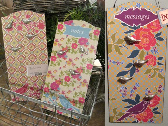 My first official day at the Atlanta International Gift & Home Furnishings Market has come to an end. Oh what a day it was…packed to the gills with meetings, dreaming of new product, seeing old friends, catching up, and of course checking out the new Laura Fair product launches! These little message boards are from Lone Elm Studios and come in 3 styles complete with little silver birdie magnets…aren’t they cute?